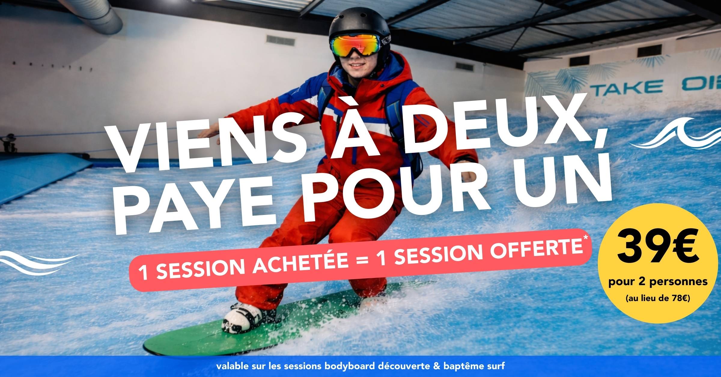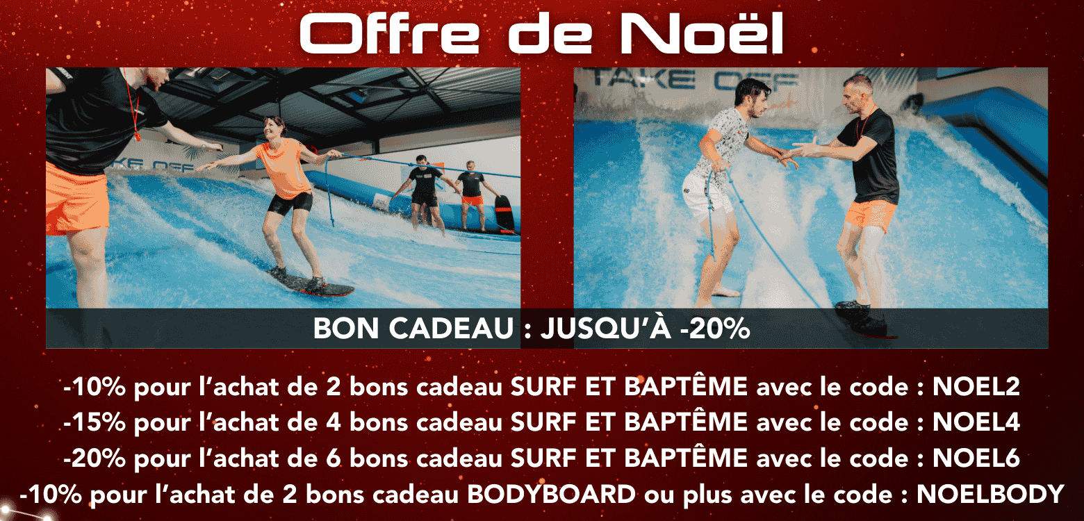 Faites découvrir à vos proches la véritable sensation de glisse sur une vague indoor ! Cette expérience unique est à la portée de tous (débutants, amateurs ou confirmés) et accessible dès 5 ans (15Kg pour le bodyboard, 25Kg pour le surf). Osez faire vivre et partager une expérience inoubliable avec Take Off.