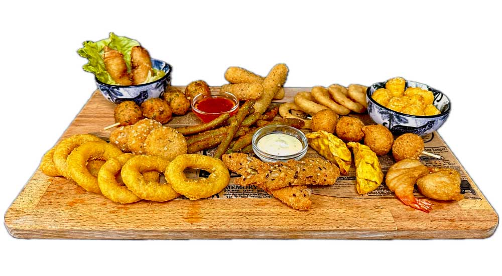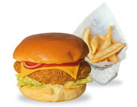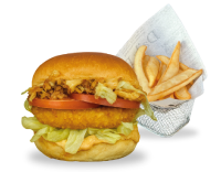 Buns brioché, poisson pané, cheddar, salade, tomate, oignons rouges, sauce creamy + accompagnement