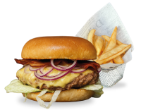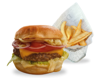 Buns brioché, steak de boeuf 150g, oignons rouges, salade, tomate, cheddar, sauce hamburger + accompagnement