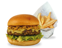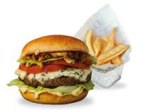 Buns brioché, steak de boeuf 150g, oignons frits, salade, tomate, fourme, sauce Take off + accompagnement