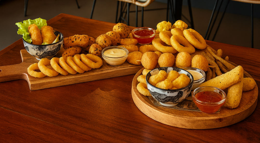 Buns brioché, poisson pané, cheddar, salade, tomate, oignons rouges, sauce creamy